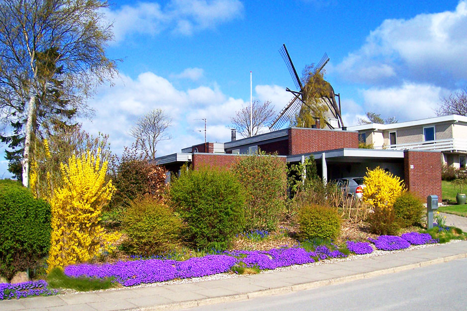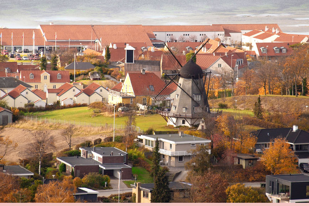 Til højre et luftbillede med Marie Mølle og vores hus helt til venstre herfor.